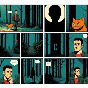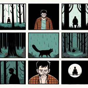 Prompt: Daniel Clowes style of nine panel comic book. No dialog, no text, no text bubbles, no text boxes. A dark place outside. Snowing. Panel 1: crows fly in forest. Panel 2: rabbit runs in snow. Panel 3: Snowstrom. Panel 5: little rabbits run. Panel 6: crows fly in forest rabbit run. Panel 7: dark forest. Panel 8: crows fly in dark forest. Panel 9: moon rises.