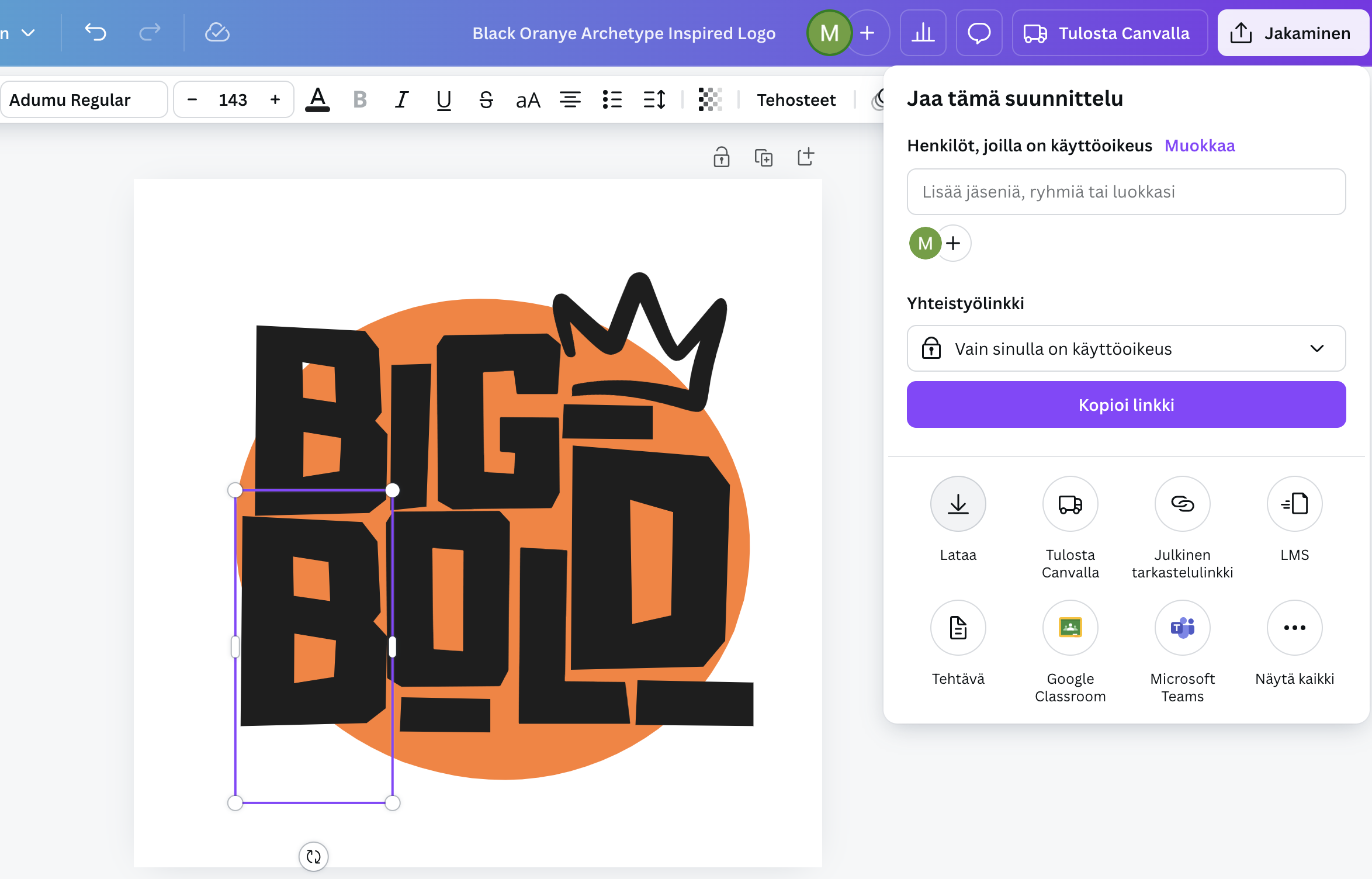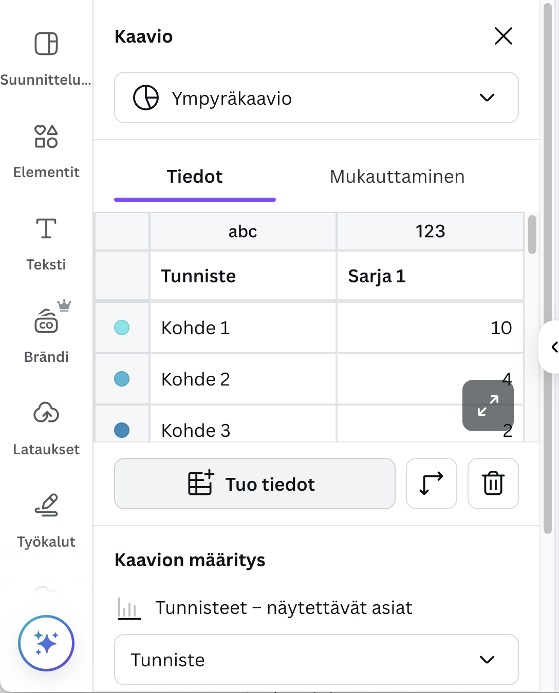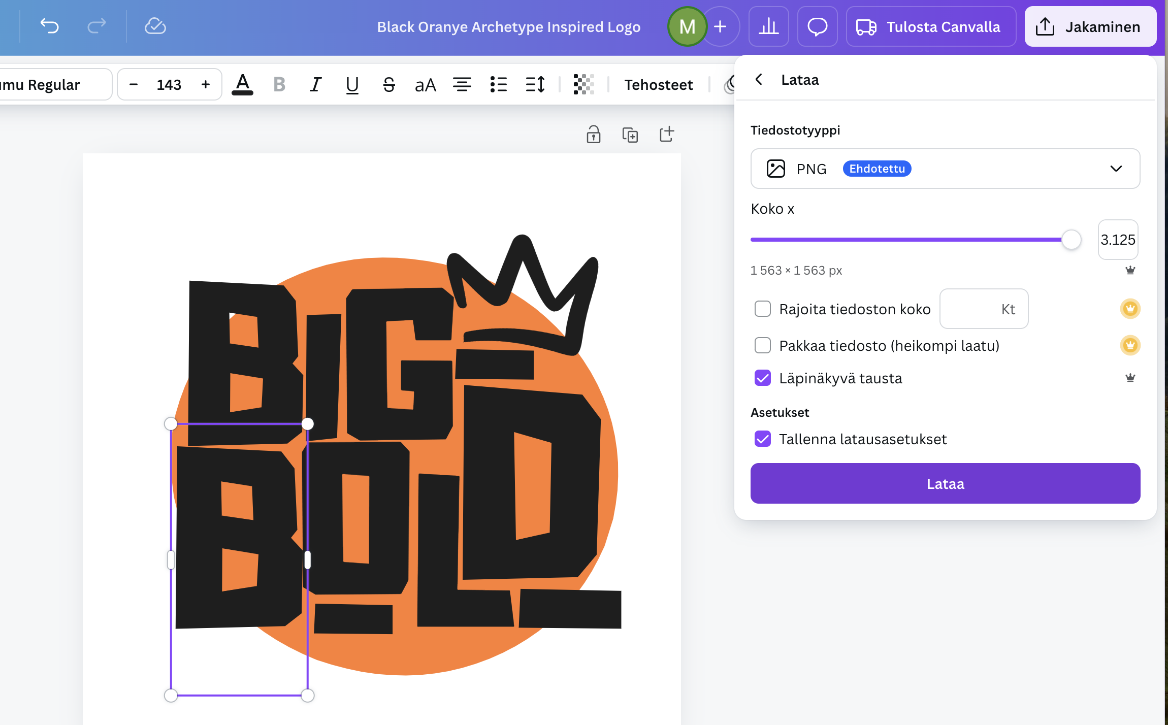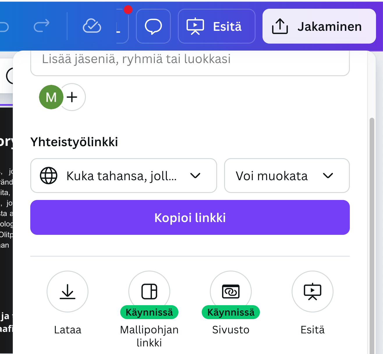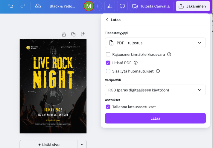 - Jos lataaminen ei onnistu, varmista että Canva on ”muokkaa” -tilassa