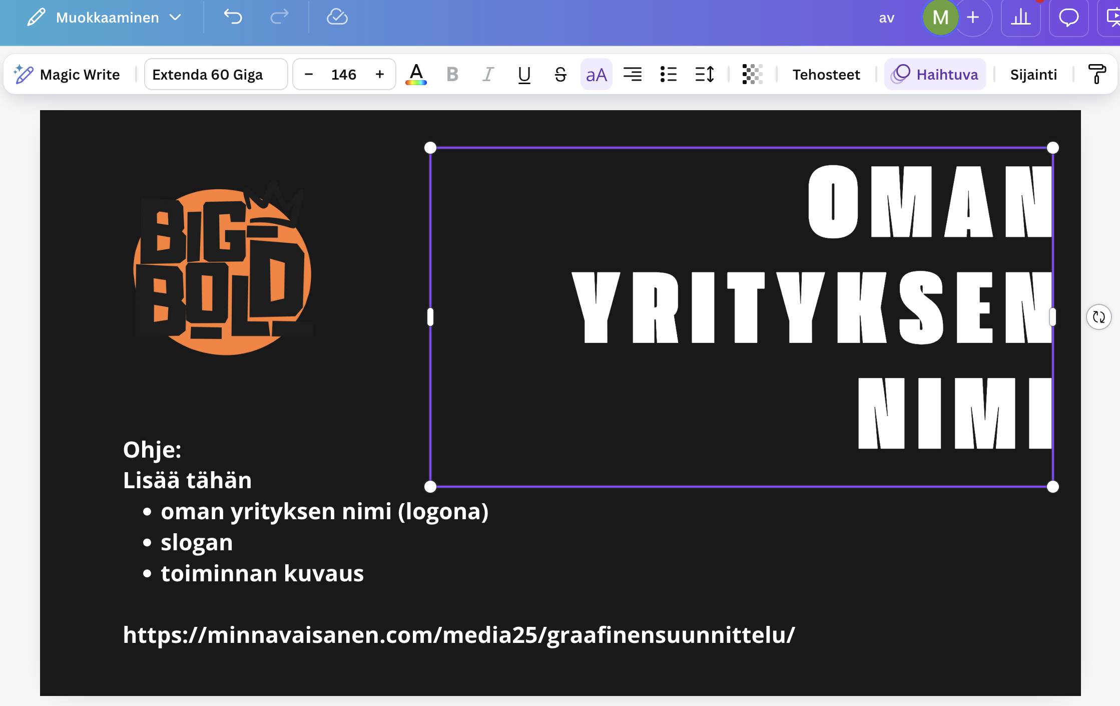 Kopioi oman yrityksen nimi, slogan ja kuvaus Canva -portfolioon