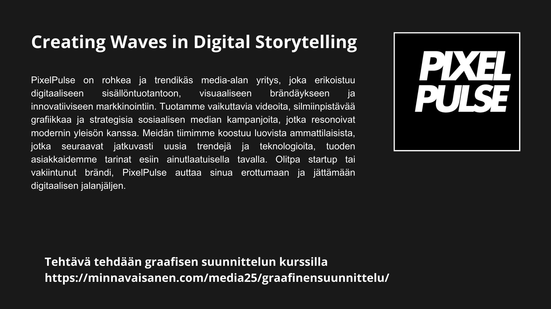 - suunnittelee ja valmistaa digitaalista grafiikkaa (mobiili- ja web -bannerit, mobiilitaustakuvia, logo harjoitusyritykselle, AI-sarjakuvia)