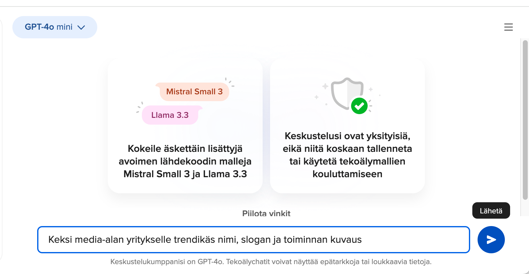 - Kopioi tämä prompt-teksti Duck.ai:n viestikenttään: Keksi media-alan yritykselle trendikäs nimi, slogan ja toiminnan kuvaus