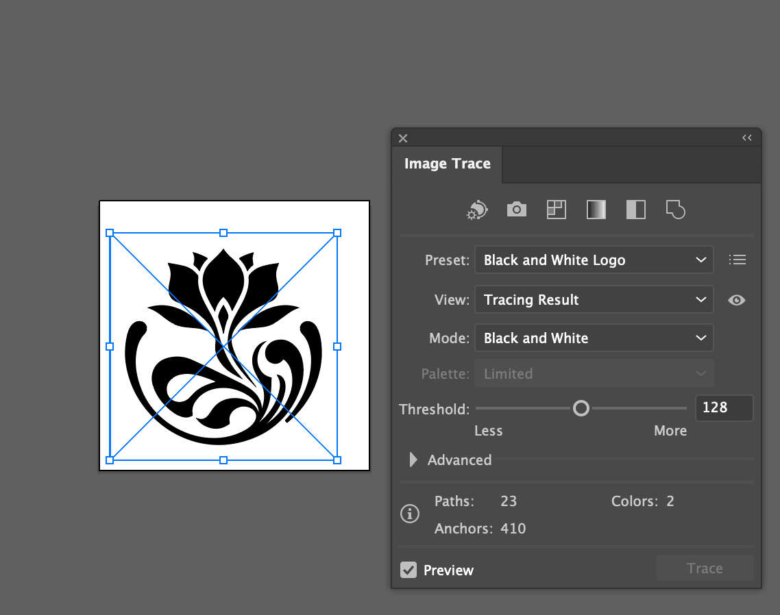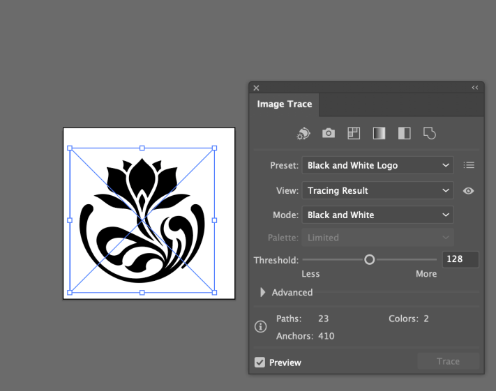 - Avaa Image Trace -paneeli: yläpalkista Window > Image Trace. Tämä avaa jäljitystyökalun (Tracing) asetukset (kelluva valikko).