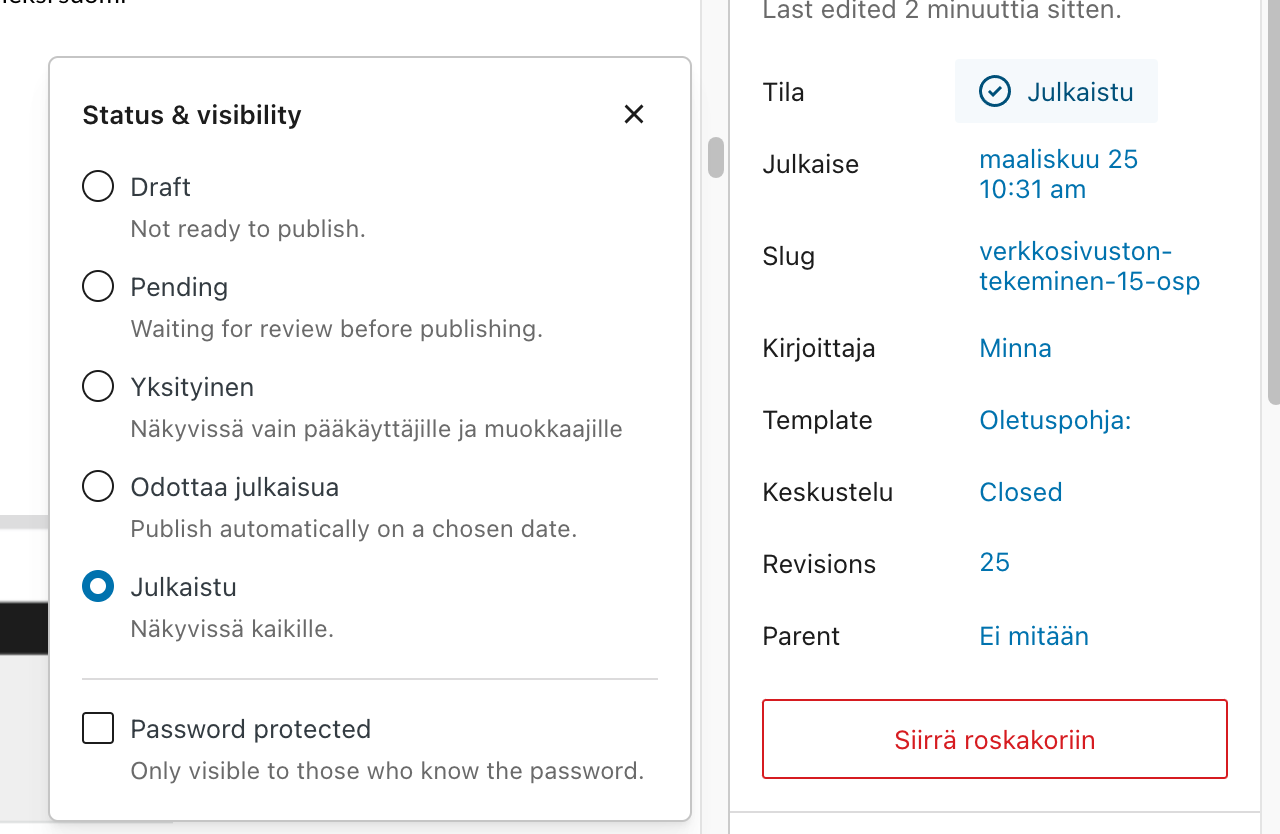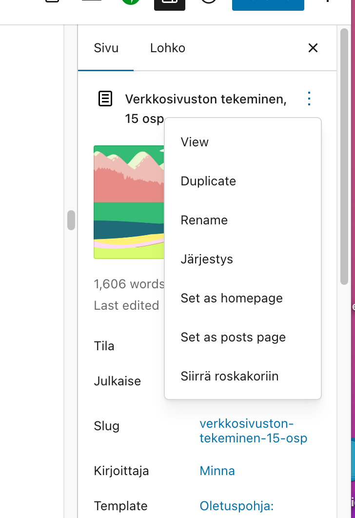 - Sivun osoite (URL) muokataan avaamalla sivu ja nimeämällä se vasemmalta avautuvasta valikosta (Slug)