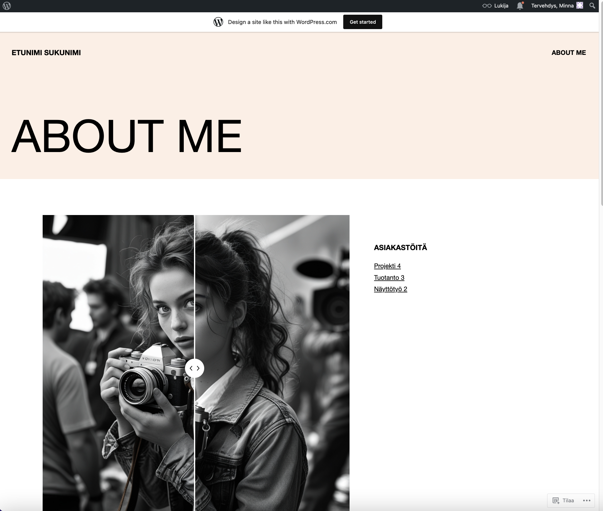 - Lisää sivulle oma valokuva, lyhyt esittelyteksti ja osaamisperusteinen ansioluettelo (projektit eli mitä olet tehnyt)